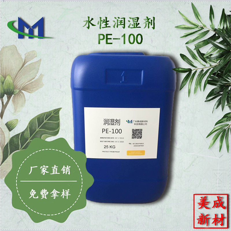 润湿剂PE-100是一种非离子型表面活性剂,对各种颜料填料具有很好的润湿性。同时又是95%活性成分的非离子表面活性剂,在水性涂料系统对各种颜填料具有良好的润湿剂。